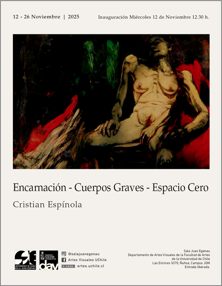 La exposición Encarnación – Cuerpos Graves – Espacio Cero estará abierta al público del 12 al 26 de noviembre, en la Sala Juan Egenau del Departamento de Artes Visuales (DAV) de la Facultad de Artes de la Universidad de Chile, ubicado en Las Encinas #3370, Ñuñoa, Campus JGM de la UChile. Horarios: lunes a jueves de 10:00 a 17:00 horas y viernes de 10:00 a 16:00 horas. Entrada liberada.