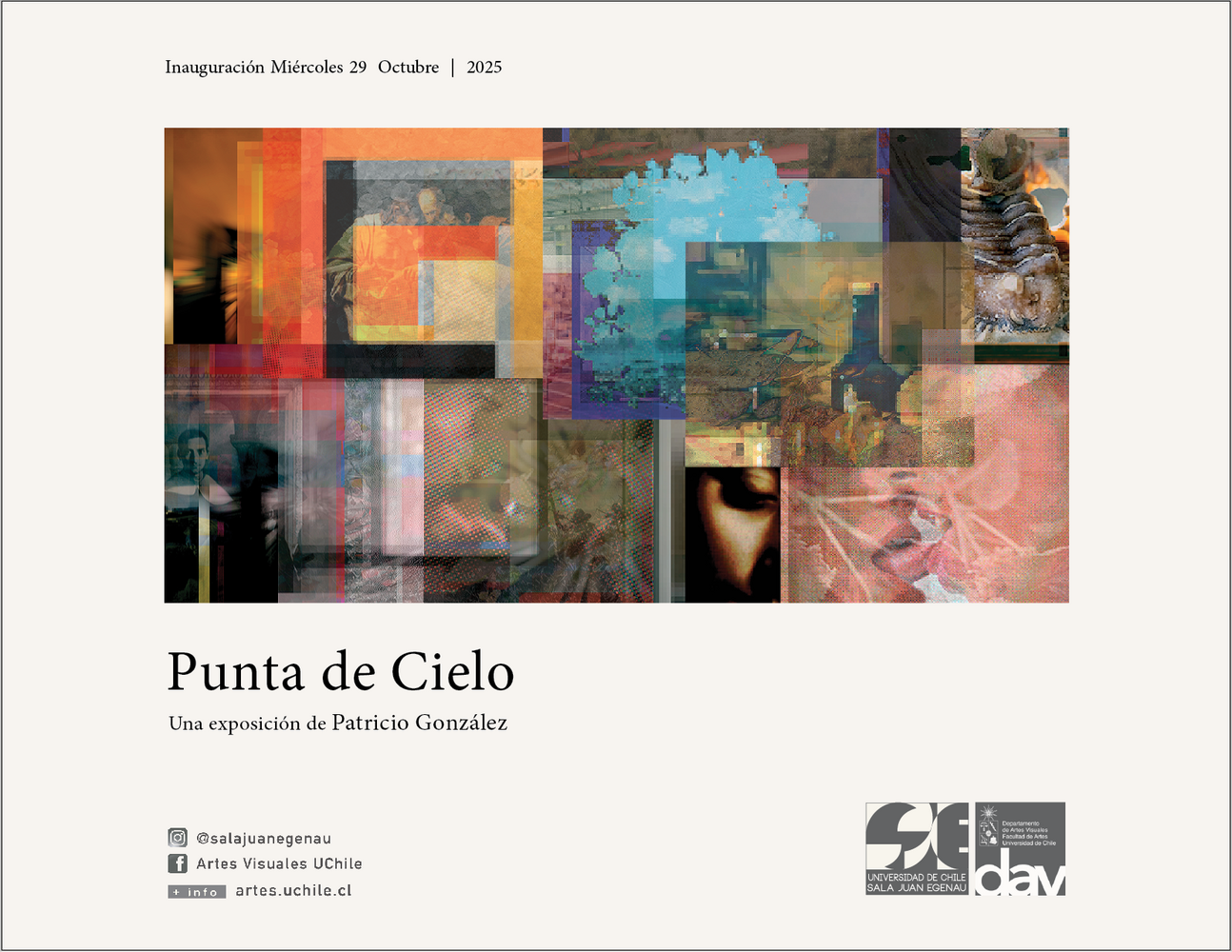 La presente exposición digital de Patricio González muestra, mejor dicho, nos recuerda la persistencia cultural del manchismo pictórico interactuando digitalmente con las estructuras geométricas de la modernidad. Es una invitación a mirar la interconexión entre el paisajismo tecnológico y la experiencia del usuario, sugiriendo una conexión arquitectónica de lo virtual con lo terrenal. El título Punta de Cielo tiene un trasfondo que insinúa cómo la computadora es una herramienta más para explorar dimensiones existenciales, llevando al espectador a una "punta" de comprensión donde lo concreto se disuelve y expande entre muchas pantallas, alcanzando, figurativamente, un "cielo" sin fin de reinterpretaciones.